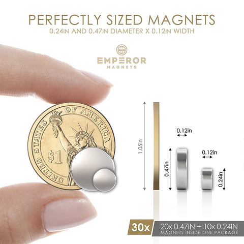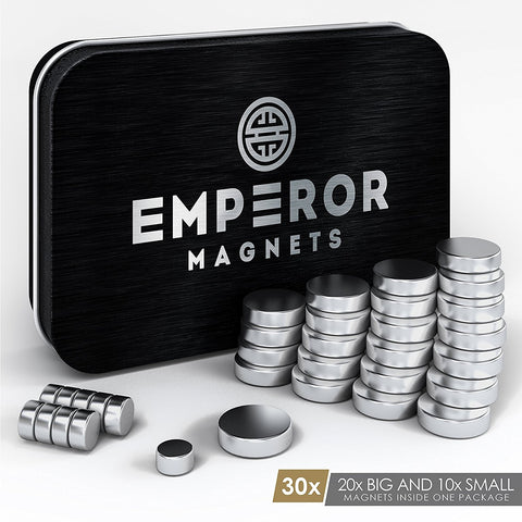 Emperor Magnets (30 pieces) - Super Strong Refrigerator Magnets | Mini Powerful Fridge Magnets | 10 Small + 20 Large Round Magnets | Metal Silver Finish Ideal For Office Whiteboard, Dry Erase Board